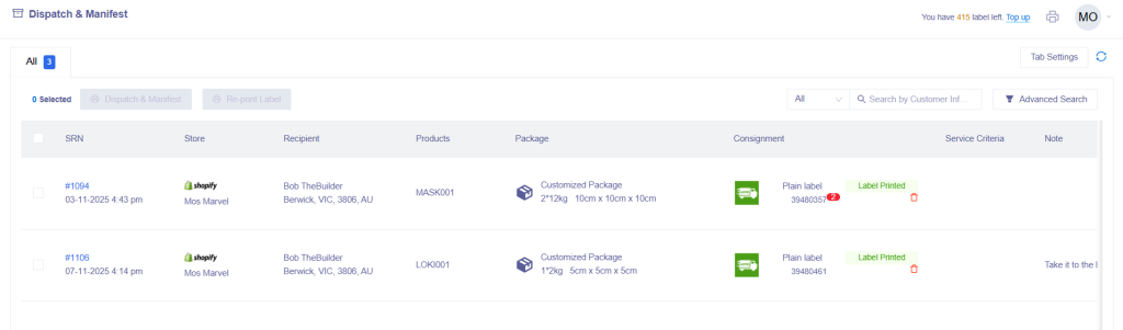 Dispatch & Manifest ButtonThis will become active when orders are selected. When clicked, it will send the information back to the carrier to book the pickup. The tracking number will be uploaded to the sales channel. You will also generate a basic manifest for you to use if needed. The order will move to the Completed section.