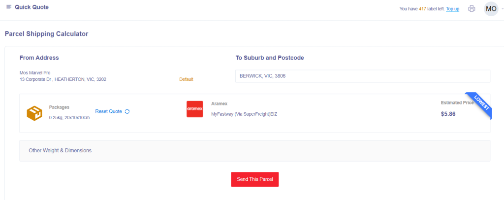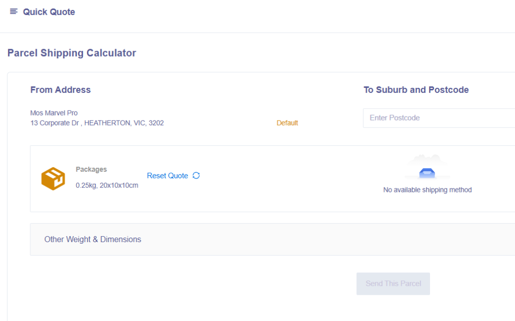 The Quick Quote function allows you to enter in a suburb or postcode, package information, and then generates the cheapest carrier for you.